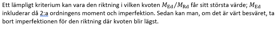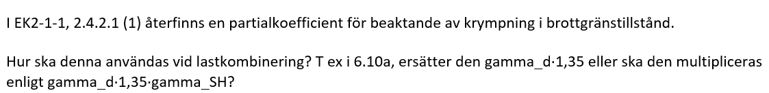 Fråga: Hur skall andra ordningens moment beräknas i bruksgränstillståndet för pelare/väggar? Om man väljer styvhetsmetoden ska man då beräkna enligt ekvation 5.28 men med styvheten EI beräknad på vanligt sätt med hänsyn till krypning och uppsprickning? Ekvation 5.21 gäller väl bara för brottgränstillståndet? Hur gör man i bruksgränstillståndet om man väljer krökningsmetoden? I brottgränstillståndet används dimensioneringsvärdet på töjningen vid krökningsberäkningen men om man då i bruksgränstillståndet använder det karakteristiska värdet på töjningen blir ofta krökningen större i bruksgränstillståndet än i brottgränstillståndet, även om man tar hänsyn till skillnaden i normalkraftens storlek. Detta verkar inte rimligt.